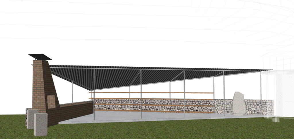 かまど小屋は、藤倉校舎の校庭の端に作ります。山の斜面の下に位置するので、山火事防止のために小屋は不燃の金属製建材を用い、完成後は、主に薪を使った地域の食文化の調理体験の場として活用して行きます。